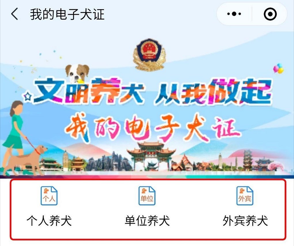 1、進(jìn)入官網(wǎng),根據(jù)已辦理的電子犬證類(lèi)型,調(diào)出電子犬證頁(yè)面,按已辦理犬證類(lèi)型選擇對(duì)應(yīng)“個(gè)人養(yǎng)犬”、“單位養(yǎng)犬”或“外賓養(yǎng)犬”。