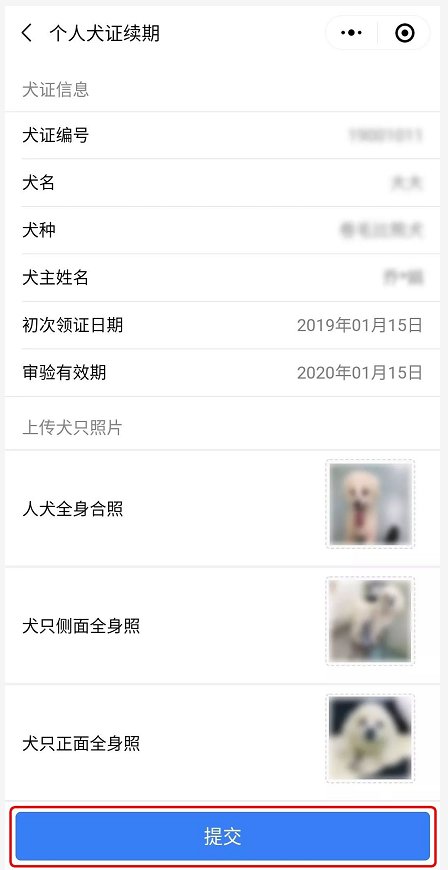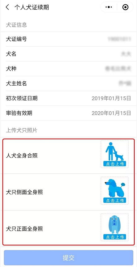 4、經(jīng)過(guò)一年,愛(ài)犬已經(jīng)長(zhǎng)大啦,請(qǐng)?jiān)谏戏街匦律蟼鹘谀c愛(ài)犬的合照,以及近期愛(ài)犬的側(cè)面、正面全身照。好后,點(diǎn)擊下方“提交”按鈕。