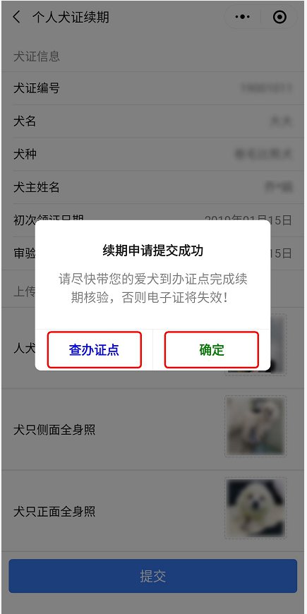 5、提交成功,您可以點(diǎn)擊“確定”,帶上愛(ài)犬到原辦理點(diǎn)辦理續(xù)期審核,也可以點(diǎn)擊“查辦證點(diǎn)”選擇就近的辦理點(diǎn)辦理續(xù)期審核。