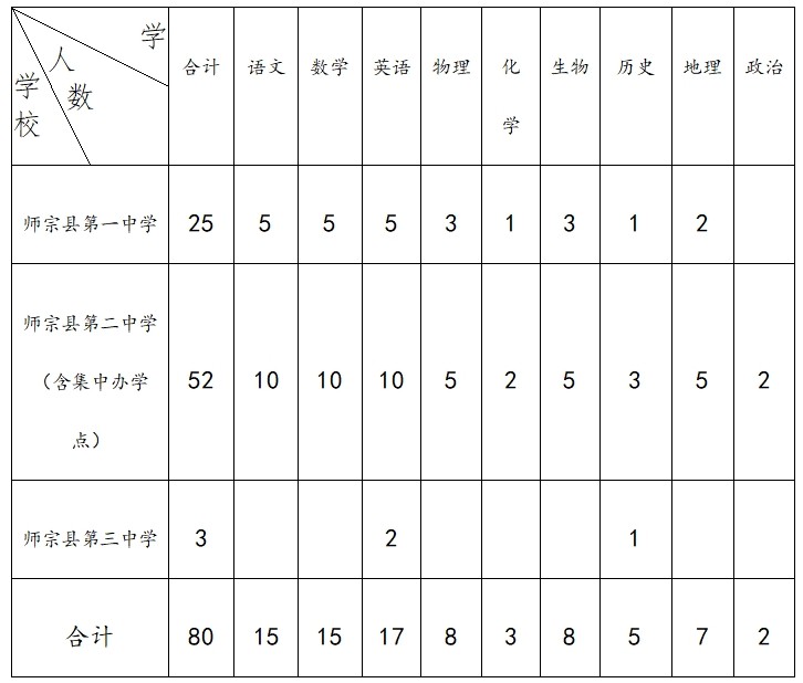 為加強師宗縣教師隊伍建設(shè),經(jīng)縣委、縣政府同意,曲靖市師宗縣教育體育局決定面向全國師范大學類本科大學(不包含師范類學院)(名單見附件1)2020年畢業(yè)的優(yōu)秀學生,公開招聘中學教師80名,現(xiàn)公告如下。