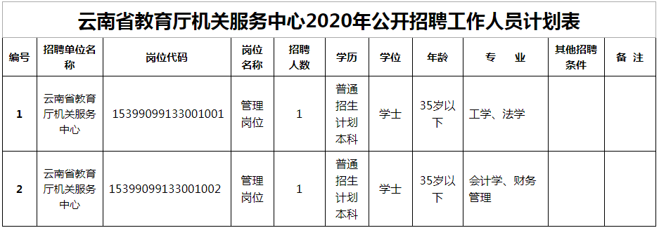 公開招聘管理崗位工作人員2名;凡符合條件的人員均可報(bào)名參加本次公開招聘。招聘范圍和條件(詳見附件1《云南省教育廳機(jī)關(guān)服務(wù)中心2020年公開招聘計(jì)劃表》),年齡計(jì)算截止日期2020年9月1日。
